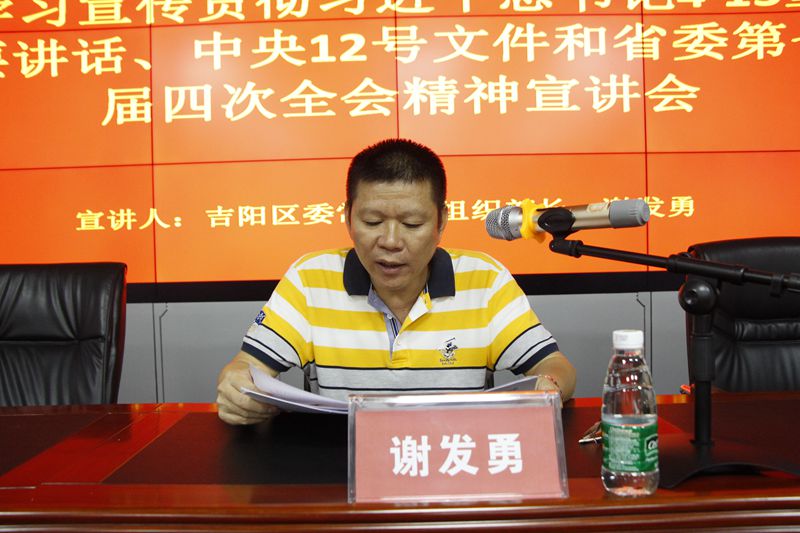 根據(jù)吉陽(yáng)區(qū)委統(tǒng)一部署,學(xué)習(xí)貫徹習(xí)近平總書記“4·13”重要講話、中央12號(hào)文件和省委第七屆四次全會(huì)精神宣講會(huì)在明佳集團(tuán)三樓會(huì)議室舉行。吉陽(yáng)區(qū)委常委、組織部長(zhǎng)謝發(fā)勇作宣講報(bào)告。集團(tuán)黨支部書記、董事長(zhǎng)陳明主持宣講會(huì)。