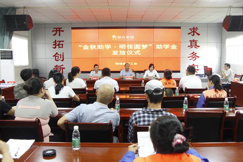 8月28日上午,明佳集團(tuán)工會(huì)“金秋助學(xué)·明佳圓夢”助學(xué)金發(fā)放儀式在集團(tuán)公司三樓會(huì)議室舉行,為8個(gè)考取大學(xué)的職工子女發(fā)放助學(xué)金共計(jì)9600元?偛藐愒、副總經(jīng)理鐘寒參加發(fā)放儀式,儀式由工會(huì)主席高斐斐主持。