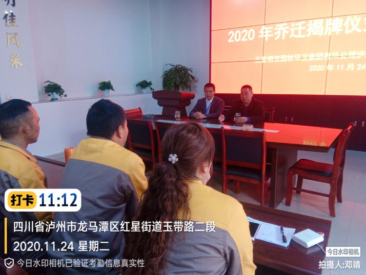2020年11月24日,明佳集團瀘州分公司新辦公室喬遷儀式隆重舉行。人大主任詹萬勇,區(qū)綜合行政執(zhí)法局環(huán)衛(wèi)股股長趙耿、重慶中仁公司昌總等領(lǐng)導來到明佳集團瀘州分公司新辦公場地,為煥然一新的辦公樓正式啟用進行喬遷揭牌。集團公司生產(chǎn)質(zhì)安部副經(jīng)理鞠彬、集團公司生產(chǎn)質(zhì)安部副經(jīng)理段永強、綜合辦公室、財務部、各部門管理人員共同見證這一歡慶時刻。