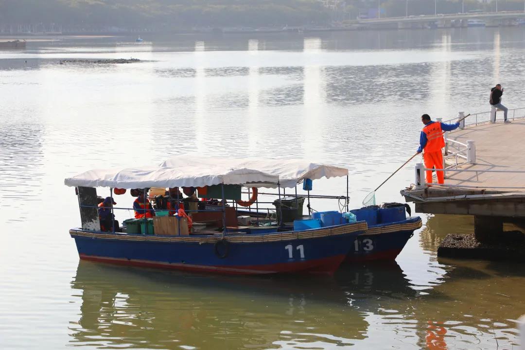 每天工作都是從早上7點(diǎn)鐘到下午的6點(diǎn)半,我們是分段來(lái)的。主要是坐船去收集河上的一些垃圾,一天巡邏清掃一次,清掃完了回來(lái)再巡邏保潔。水面和紅樹(shù)林里的垃圾都要清理。下雨天我們也要出來(lái)(工作),臺(tái)風(fēng)天就要做好防風(fēng)的工作,如果是下雨,我們一樣要出來(lái)打撈垃圾。